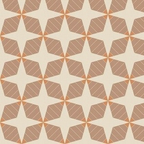 A geometric, block-print style design full of energy. Warm terracotta and rust accents sit against a neutral ground, bringing refined desert warmth into the home through a structured repeating pattern.